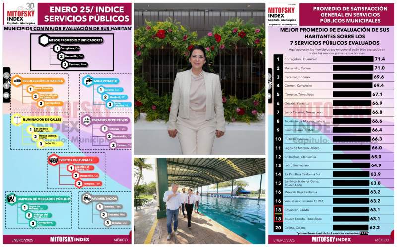 El análisis integrado al Capítulo Municipios de la casa encuestadora, fue realizado durante los meses de diciembre de 2024 y enero de 2025 en las 150 ciudades más importantes del país, siendo el municipio presidido por la Alcaldesa Mónica Villarreal Anaya como el quinto mejor evaluado con un promedio acumulado del 67.1 por ciento.