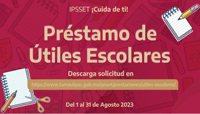 Ciudad Victoria, Tamaulipas.- En apoyo a la economía de los servidores públicos del Gobierno del Estado, el Instituto de Previsión y Seguridad Social del Estado de Tamaulipas, pone a disposición de los trabajadores durante todo el mes de agosto, un préstamo para útiles escolares por la cantidad de $1,200 a pagar a ocho quincenas sin intereses.